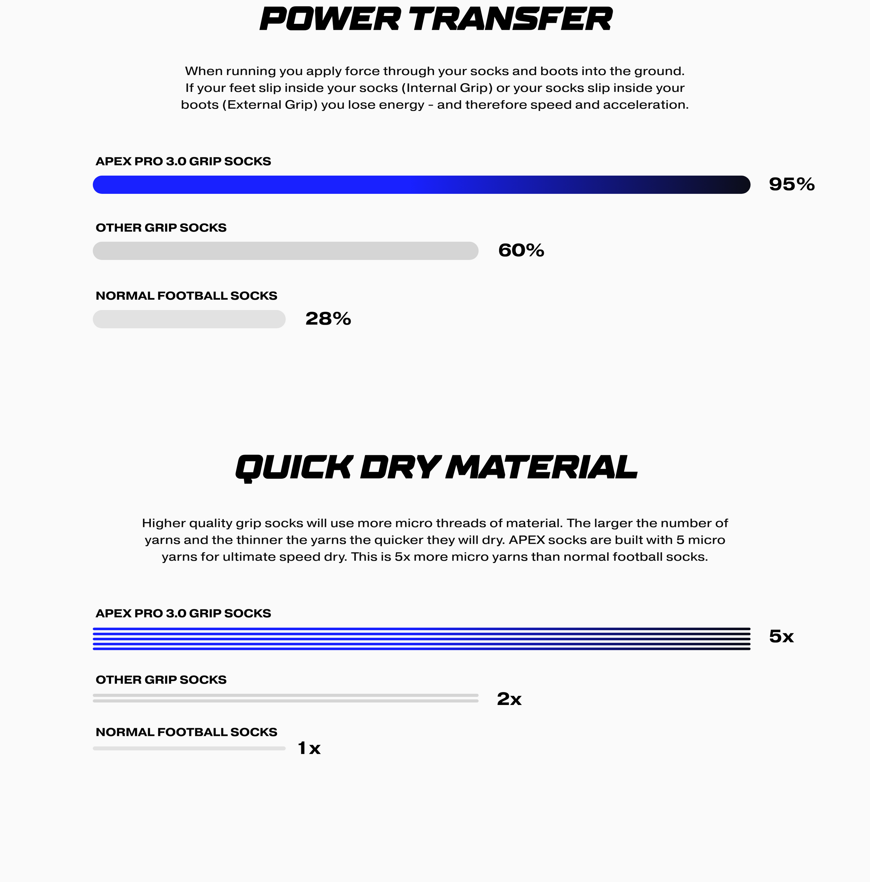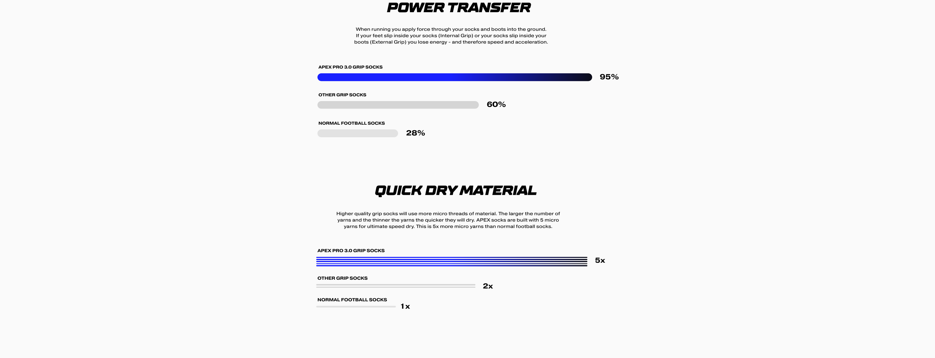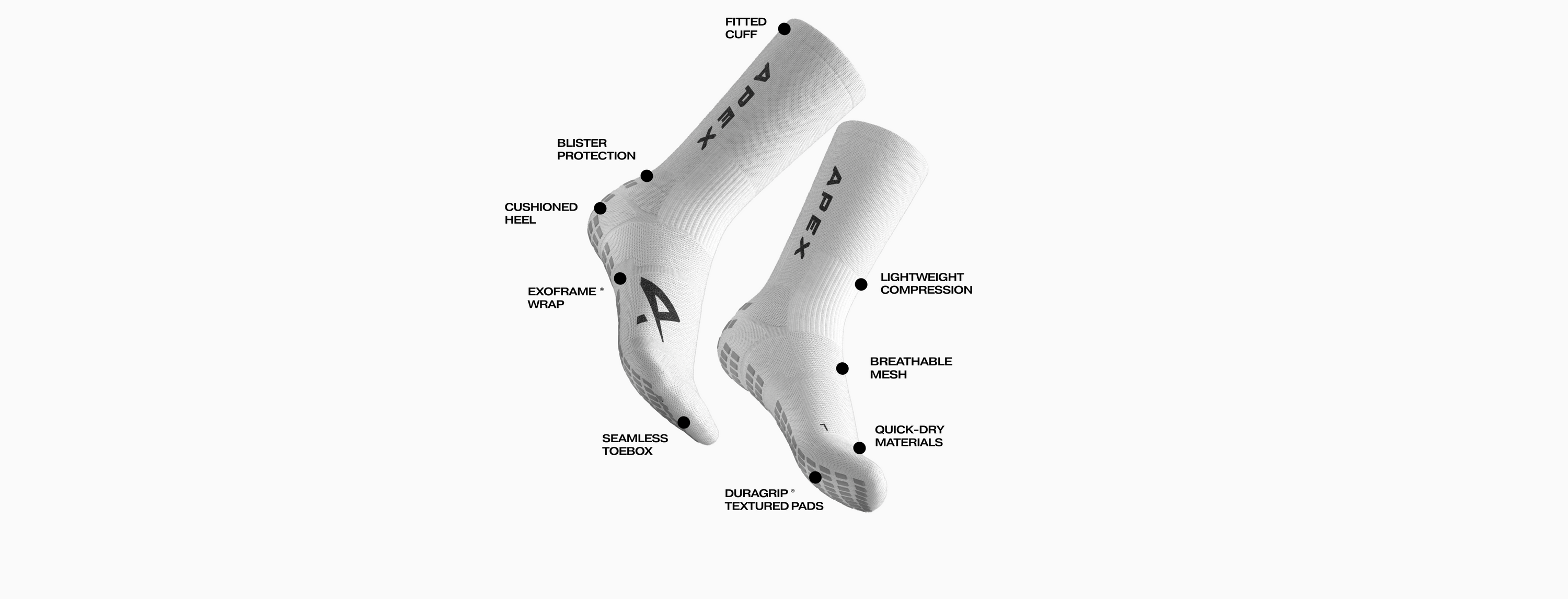 The ExoFrame® is built to ensure your foot doesn't slip inside the sock. Meaning when you turn, accelerate, and stop you don't lose power transfer and vital milliseconds waiting for your feet to adjust. Combined with our advanced grip pads, Apex socks maintain contact with your boots insole creating zero slippage, all because of our ExoFrame®